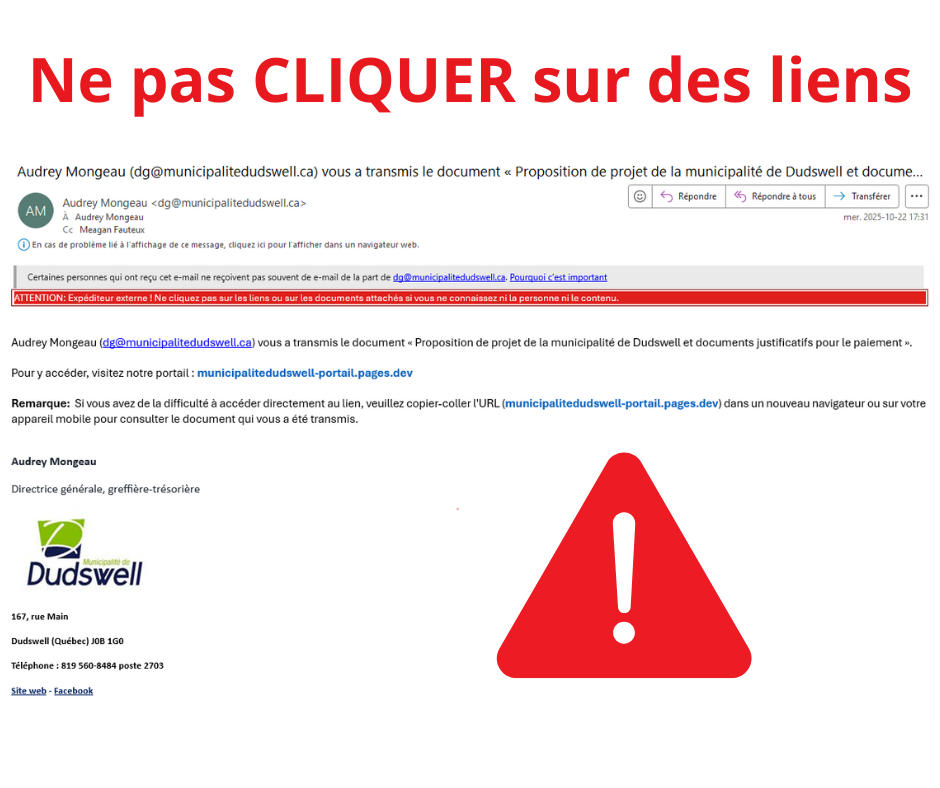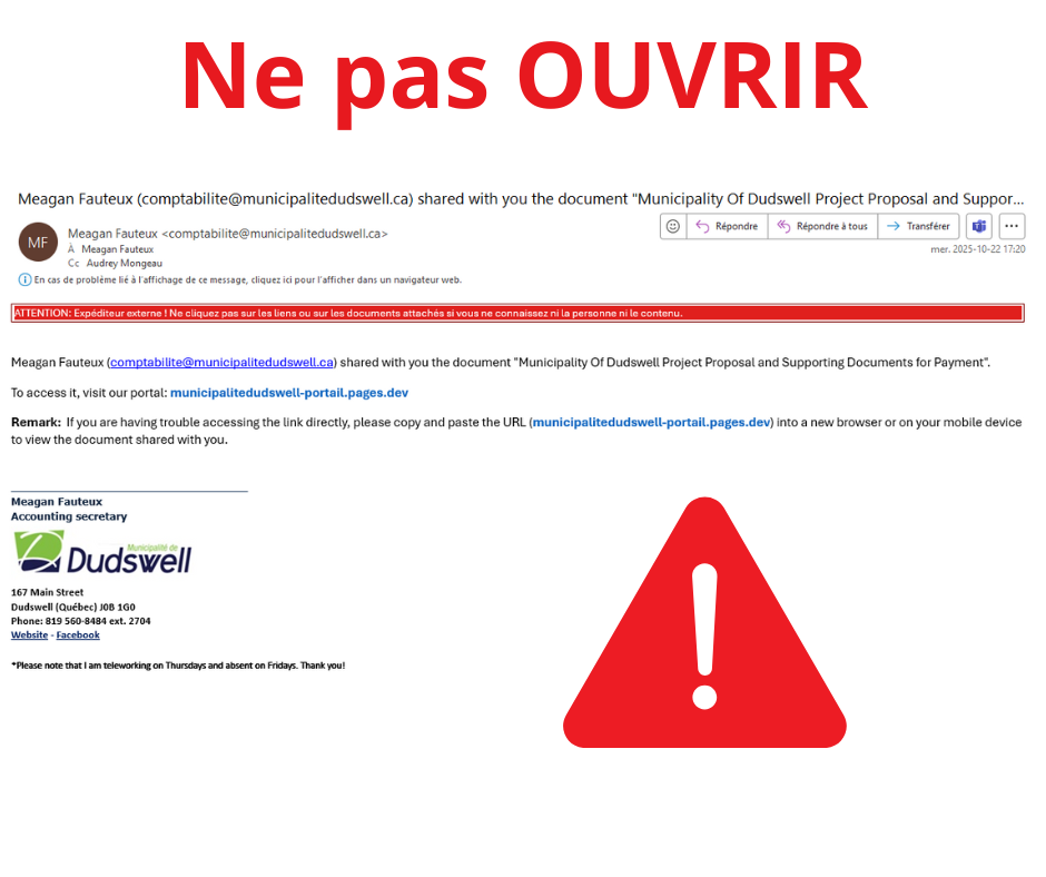 Si vous recevez un message suspect semblant provenir de la Municipalité, de la direction générale ou du service de comptabilité, ne l’OUVREZ SURTOUT PAS et ne CLIQUEZ SUR AUCUN LIEN.