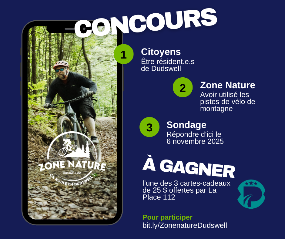 Tirage le 6 novembre 2025 parmi les résidents qui auront complété le sondage. Les gagnants seront contactés directement et annoncés sur notre page Facebook.
